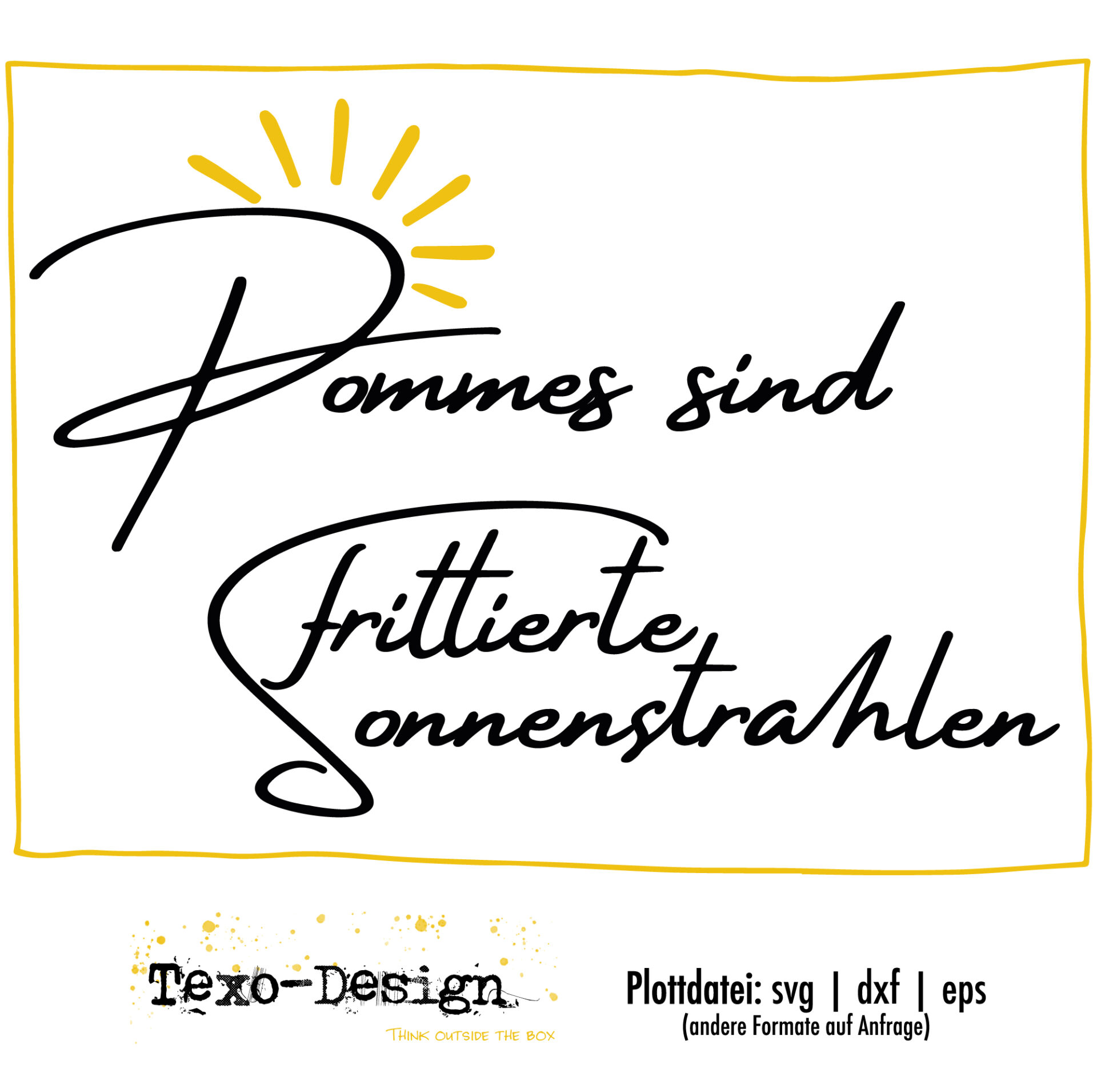 Mit diesem Artikel erwirbst du die Download Datei „Pommes sind frittierte Sonnenstrahlen“. Nach Bezahlung bekommst du ein Mail mit dem Download Link. Darin befindet sich eine zip- Datei mit den 3 genannten Formaten.